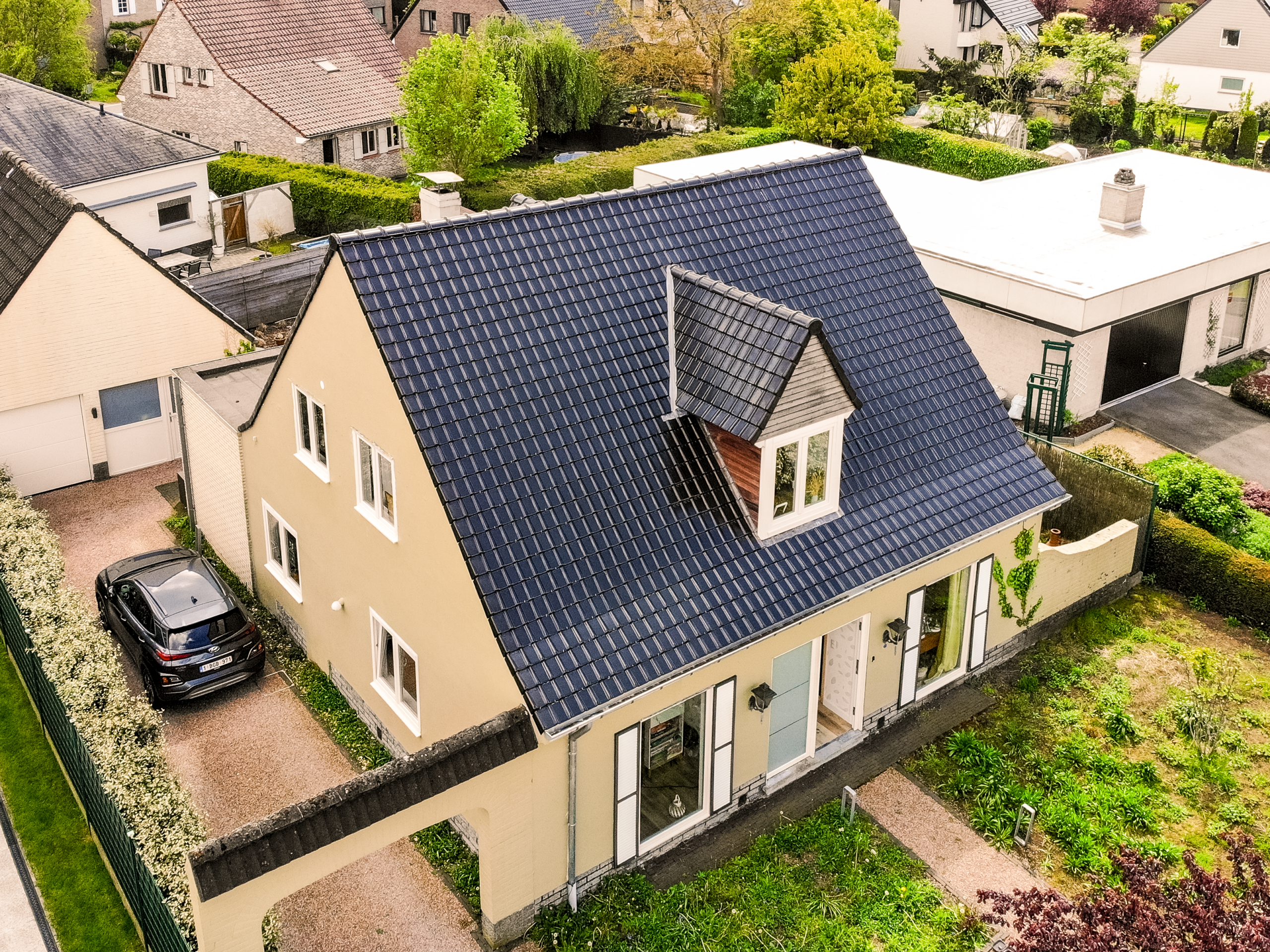 In De Pinte voerden we een volledige dakrenovatie uit met oog voor detail. Het bestaande dak werd vernieuwd met de Koramic Stormpan 44 in antraciet. Deze pan is een vaste waarde in onze regio: hij biedt niet alleen een strakke, moderne lijnvoering, maar is door zijn dubbele sluiting ook uitermate bestand tegen de steeds frequentere stormen in ons land. De mat-antraciete kleur vormt een rustige basis die de architectuur van de woning versterkt zonder te overheersen.